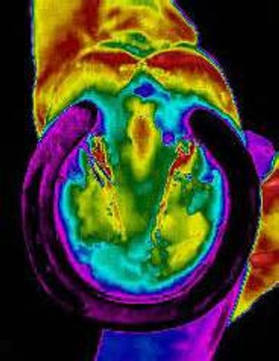 An abscess is an extremely localized infection, which is generally "walled off" within the hoof capsule. There are numerous causes for such infections; however, the primary causes are fungal infections, puncture wounds, and seedy toe. Left unattended, an abscess will migrate up the hoof capsule, following the path of least resistance, until it eventually "blows out" through the hoof wall or, often, at the coronary band , when the abscess blows out the corornary band it is called a "quittor". In this image to the left is a "solar abscess". Clearly you can see where all the red (heat) is. The abscess completely wraps around the frog area.